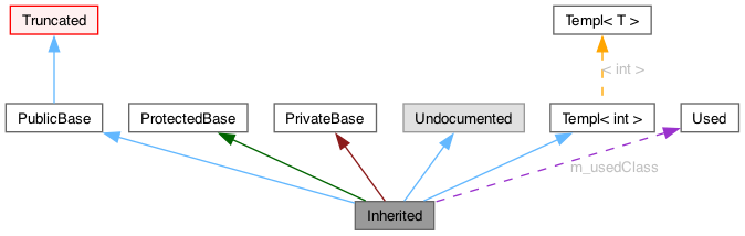 • A purple dashed arrow is used if a class is contained or used by another class. The arrow is labeled with the variable(s) through which the pointed class or struct is accessible.